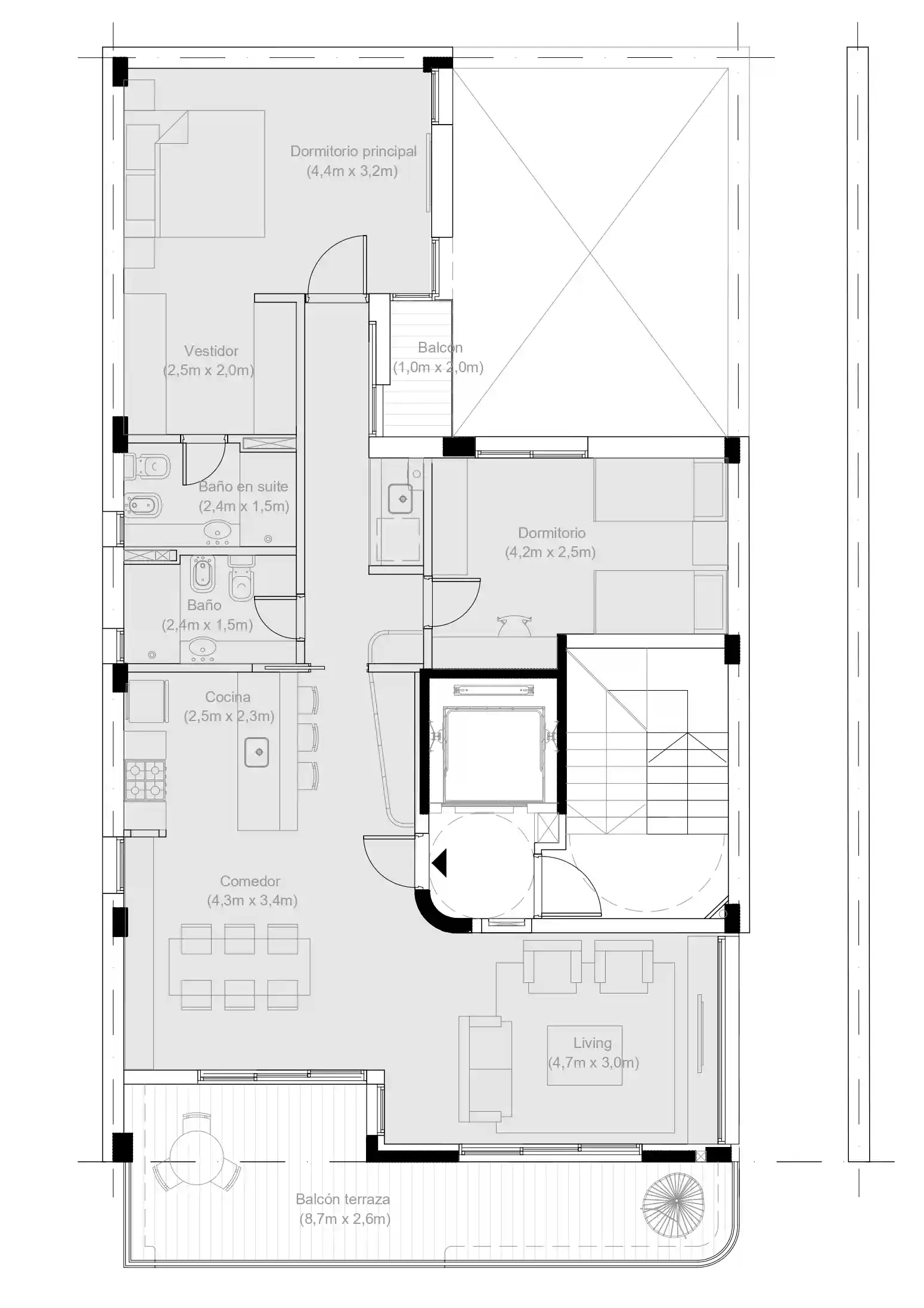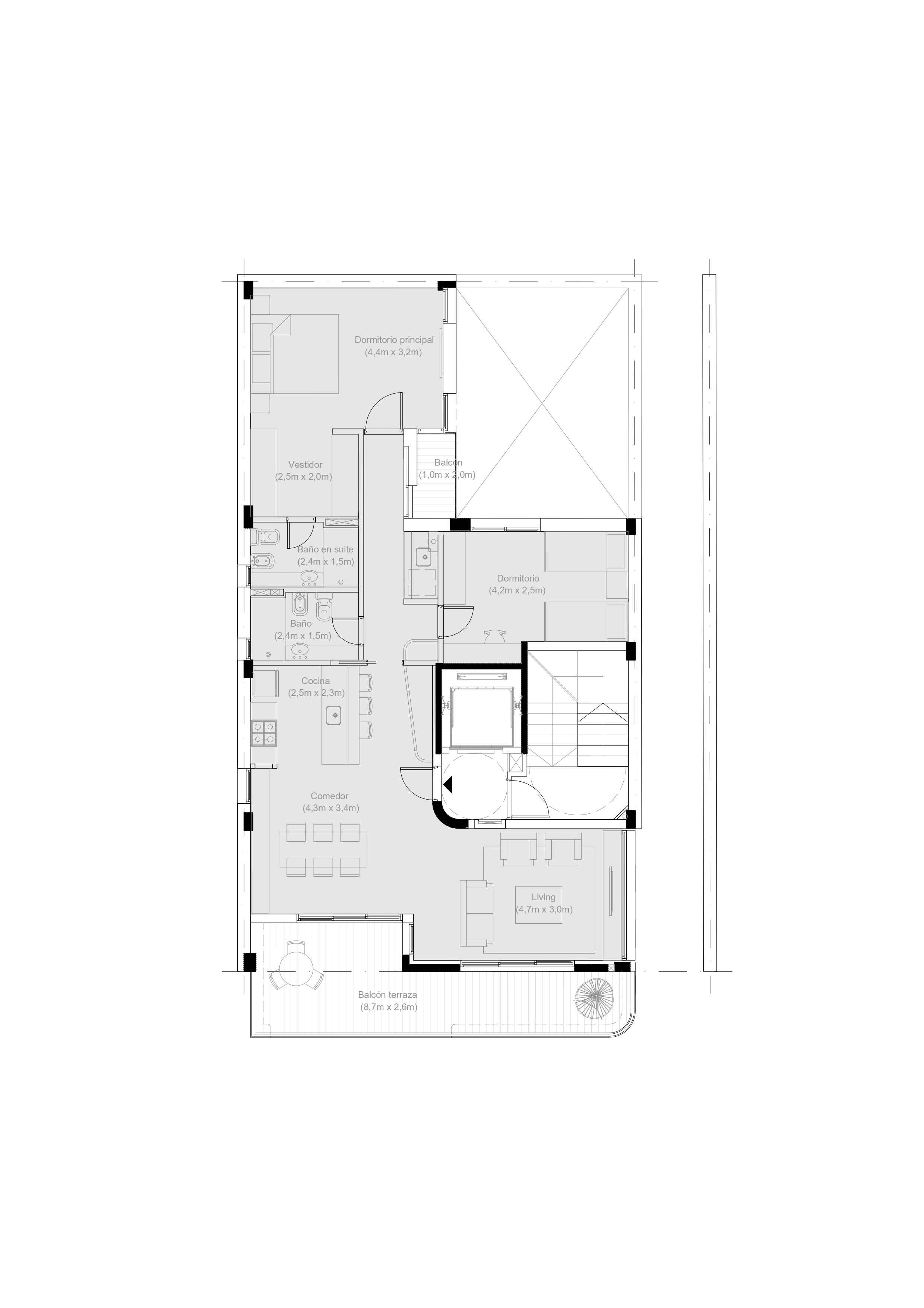 Nos detenemos en la habitabilidad de los espacios comunes, en las reuniones con amigos y familias. La terraza se convertirá en un lugar clave para crear momentos: una gran mesa, la parrilla, el solarium junto a la ducha, un espacio verde que te invita al relax y al disfrute.